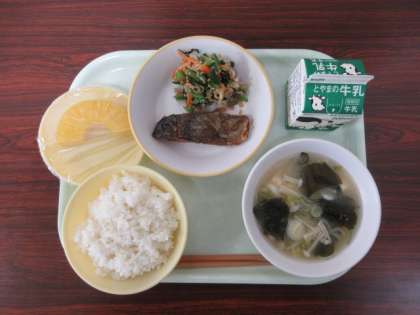 今日の献立は、ご飯  魚の蒲焼き  みそ汁  はりはり和え  カットパイン  牛乳でした