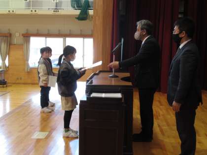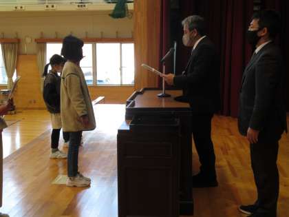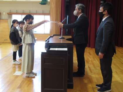 令和3年度修了式が行われ、校長先生から各学年の代表の人たちに修了証が渡されました。