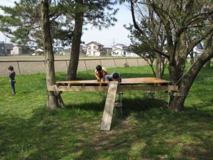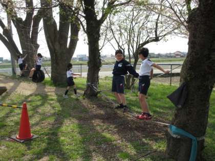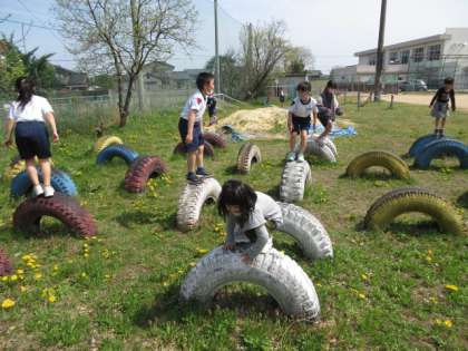 春の陽差しに誘われ、思い思いにグラウンドで遊んでいます。