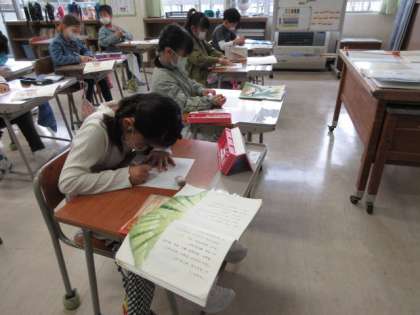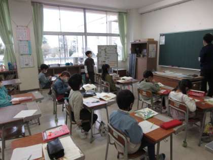 どのように工夫して音読をするか話し合っています。聞いている友達の方に体の向きを変えながら発表しています。