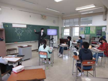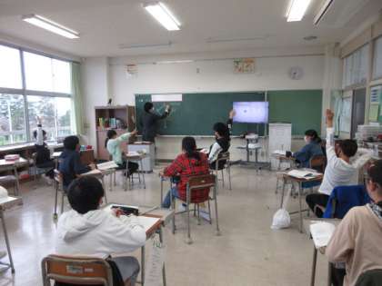 線対称な形の特質について話し合っています。とても集中して授業に参加しています。