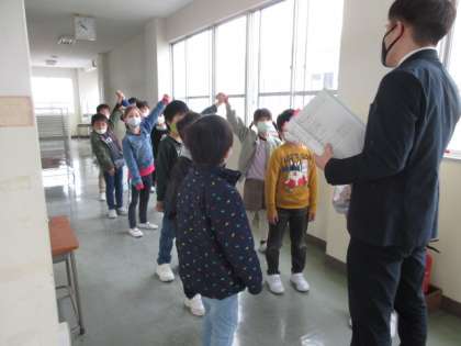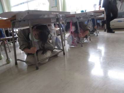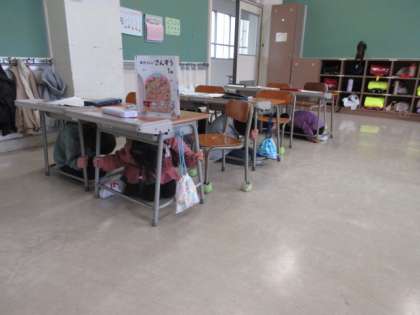 今年度初めての避難訓練。地震が起きたときの身の守り方について訓練しました。放送を静かに聞き、机の対角の脚をしっかり押さえ、頭を守っています。廊下への移動も落ち着いて訓練できました。