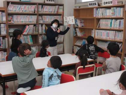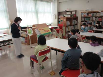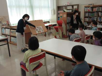 図書館司書の先生に、図書室の利用の仕方を教えていただいています。パネルシアターで言葉遊びを楽しみました。