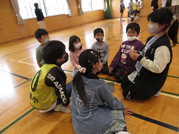 各なかよし班担当の先生方が紹介された後、各班で自己紹介をしました。始めは少し緊張ぎみな表情でしたが、6年生が考えた自己紹介カードで、うち解けてきました。