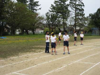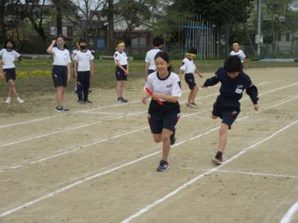 5・6年生合同でのリレー練習。リードのタイミングやバトンの渡し方など、声をかけ合いながら練習しています。