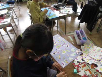 自分で描いた模様などを切り取り、組み合わせを考えながら貼り合わせています。多彩な色合いで、気分も明るくなってきます。