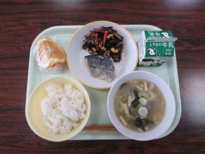 今日の献立は、ご飯 鰆の塩焼き 高野豆腐のみそ汁 ひじきの炒めに サンフルーツ 牛乳 でした。