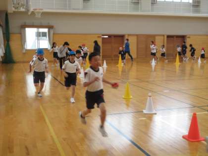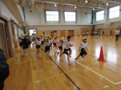 体育館での体力づくりタイム。3分間で体育館を6周以上走った人もいました。
