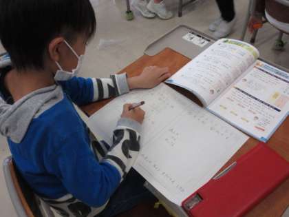 足し算の筆算、マス目に合わせ位に注意しながら正確に計算しています。