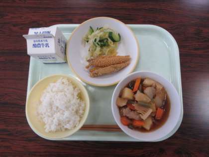 今日の献立は、ご飯 豚肉とじゃがいものうま煮 きびなごのさくさく揚げ あわせ和え 牛乳 でした。