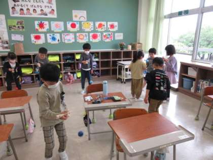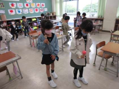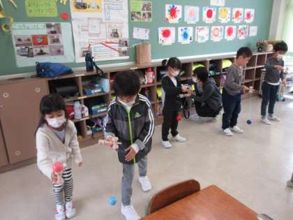 新しく購入した人のけん玉が届き、早速全員で練習に励みました。皿の持ち方を教えてくれる人も。11日のけん玉級位認定会が楽しみです。