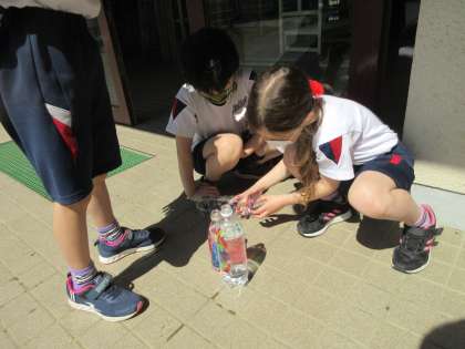 2年生は、「光のプレゼント」を作りました。透明な入れ物に色ペンで色を塗り、日光を通して、様々な模様を浮かび上がられます。