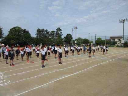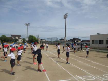 開閉会式の練習をしました。姿勢や礼の仕方を確認しながら集中して取り組んでいます。2回目のラジオ体操練習では、1日目よりもきびきびと行う姿が見られました。
