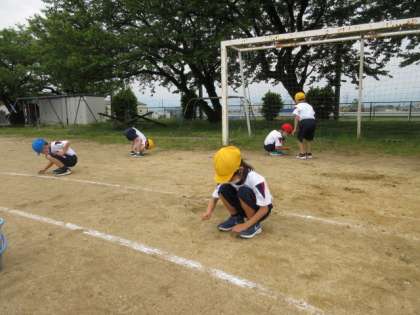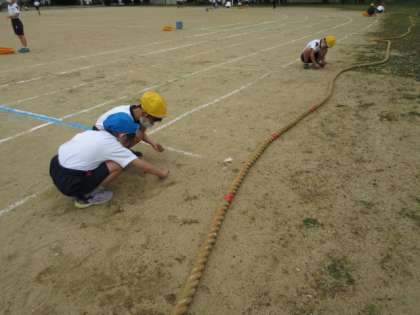 明日の予行練習に備え、1〜3年生はグラウンドの石拾いや草抜きをしました。
