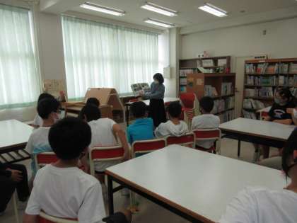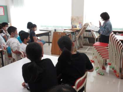 学校司書の先生に読み聞かせをしていただきました。読んでいただいた物語に出てくる植物の紹介もしていただき、真剣に聞いていました。