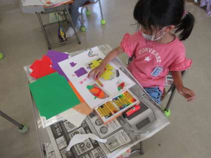 ちぎった紙を貼り、好きなものの形に見立てて作品を作っています。