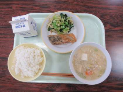 今日の献立は、 ご飯 魚の竜田揚げ 呉汁 小松菜ひたし 牛乳 でした。