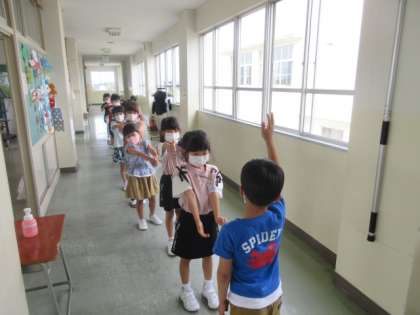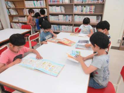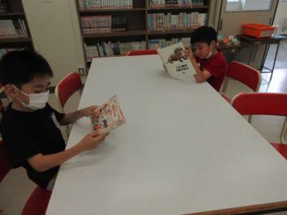 1列に並んで図書室へ。好きな本を読んだり借りたりしました。