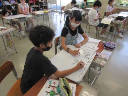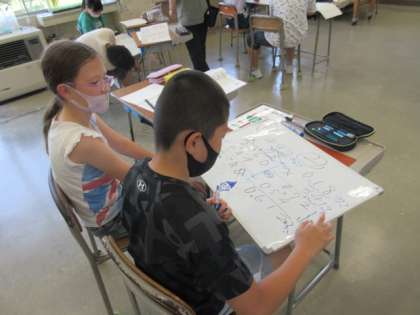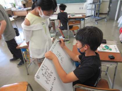 小数のわり割の筆算をホワイトボードに書いて、ペアで確かめあっています。