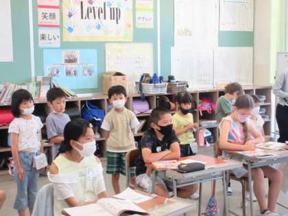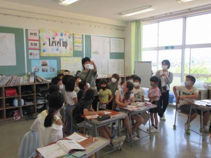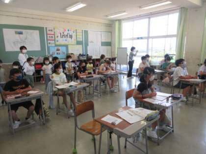 学校探検で、4・5・6年生の教室の様子を観察しました。5年生の外国語の授業では誕生日を英語で言う場面に参加し、一緒に学習しました。