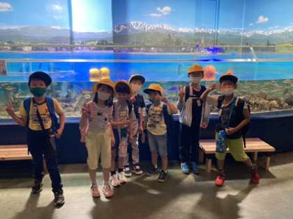 魚津水族館で、水辺の生き物を観察したり、水辺の生き物に触れたりしながら楽しんでいます。