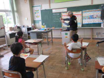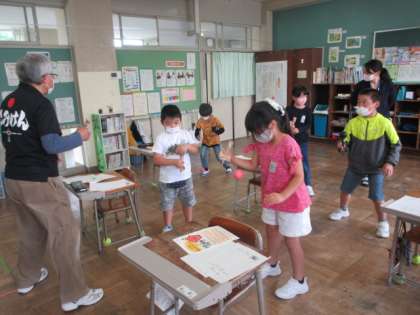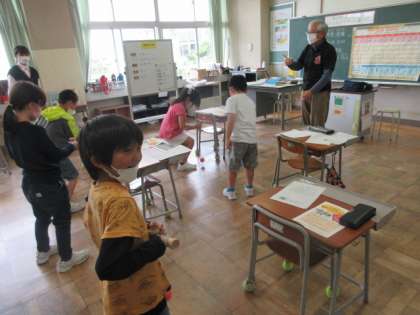 「地域のすてき」を見つけようの学習で、けん玉名人の先生に来校していただき、けん玉のこつや、けん玉を始めたきっかけ等を話していただきました。一人一人に上手くできるためのこつも教えていただき、安定してけん玉を操ることができるようになってきました。