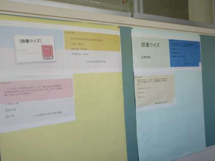 今週は読書週間として、給食の時間中に図書委員会から本にまつわる上・下学年用クイズが出されます。どれも超難問ばかり。図書室にも問題が張り出されています。全問正解者はお楽しみ袋がもらえることになっています。