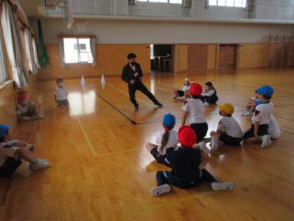 反復横跳びや立ち幅跳びの練習をしています。まず先生が手本となって跳び方と数え方の確認をしました。以前よりどれだけ記録が伸びたかが楽しみです。
