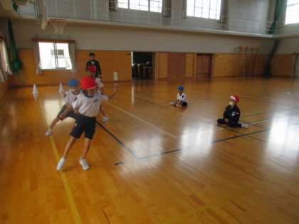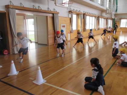 反復横跳びや立ち幅跳びの練習をしています。まず先生が手本となって跳び方と数え方の確認をしました。以前よりどれだけ記録が伸びたかが楽しみです。