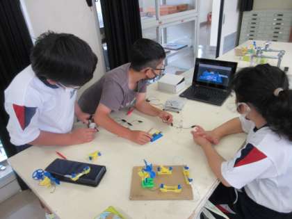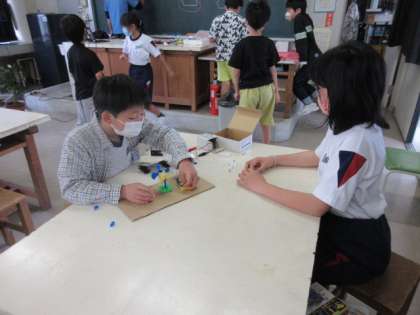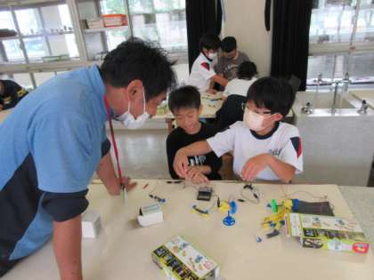 直列と並列の正しいつなぎ方に挑戦しています。回路になっているか、電池の向きは正しいか、ショートしていないが、グループで話し合いながら進めています。