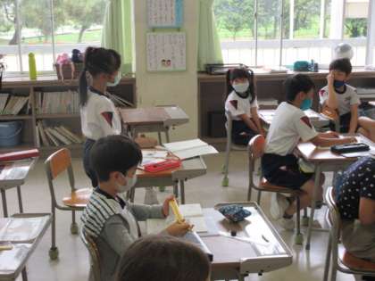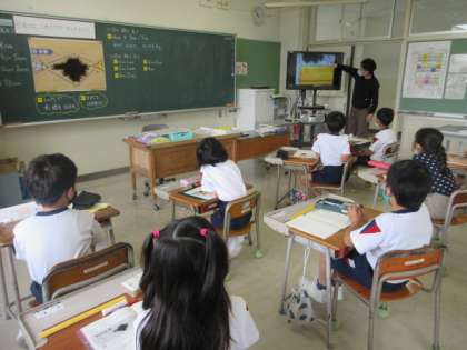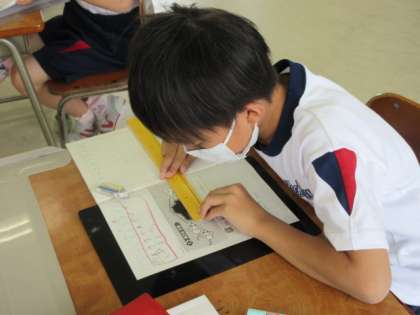 折れ曲がった線の正確な長さの測り方を話し合いました。物差しの目盛りの読み方は、実物を拡大して確認し合いました。