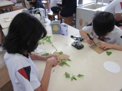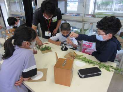 植物の水の通り道について、色水の様子を見ながら解剖顕微鏡で確かめています。