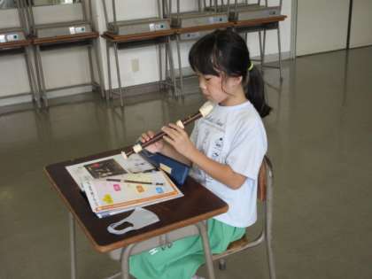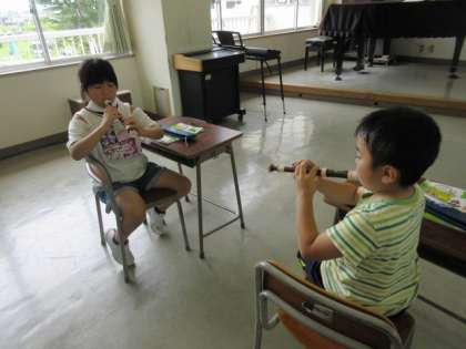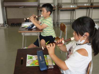 初めてのリコーダーに興味津々です。早速、音色を響かせていました。