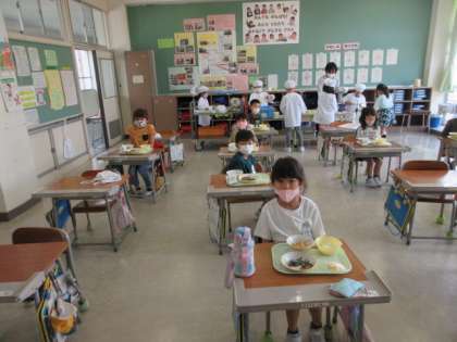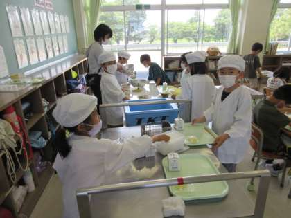 手際よく給食の準備を進めています。