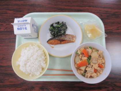 今日の献立は、ご飯  卵とじ  ふくらぎの照焼  よごし  冷凍りんご  牛乳  でした。