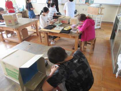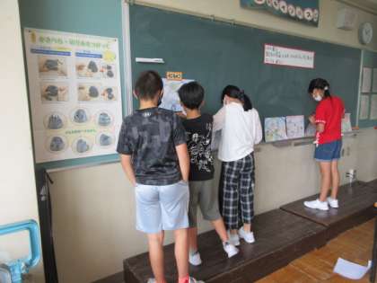 友達の描いた「未来の富山」の素敵なところや工夫していると思ったことをカードに書いて貼っています。発想豊かな作品が出来上がりました。