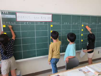 算数科では、長さの学習をしています。「cm」や「mm」などの単位を学習したので、身の回りの物の長さを竹物差しで測りました。どれだけの長さか予想をしてから、実際に測ってみました。
