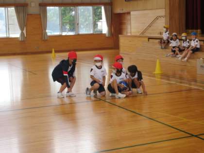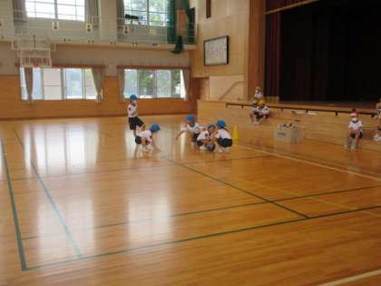 キックベースボールにルールを確認後、実際にボールを受け止め全員で座る練習をしました。チームワークが鍵となりそうです。
