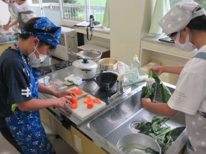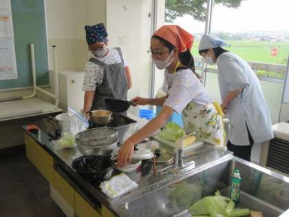 調理実習の2回目。今回は自らゆでる野菜とお湯からゆでる野菜を選び、切り方、大きさ、ゆで時間などを確認しながら調理しました。調理の仕方も、前回より手際よくなっています。
