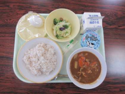 今日の献立は、麦ご飯 カレーライス ゆでたまご ビーンズサラダ ヨーグルト 牛乳 でした。