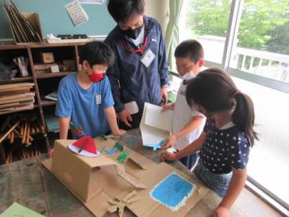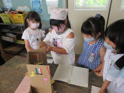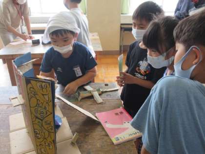 2年生を招待し、作品展覧会を開きました。始めは緊張気味だった説明も、会話をする中で上手になってきました。