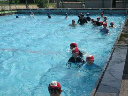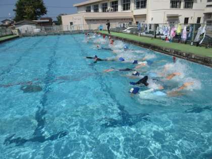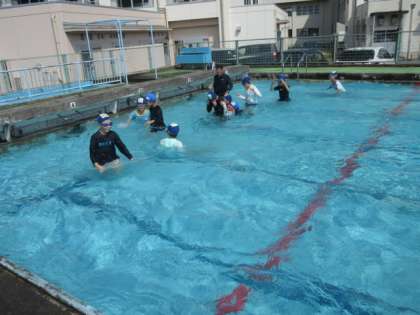 スール掃除を頑張った、4・5年生。学校のプールでの初泳ぎ。気持ちよさそうです。
