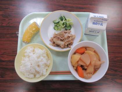 今日の献立は、ご飯 豚肉のジャンロー 炊き合わせ きざみ和え バナナ 牛乳 でした。