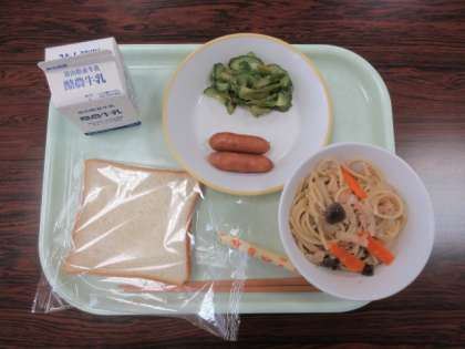 7月5日(火) 今日の給食 公開日 2022/07/05 更新日 2022/07/05 給食室から 今日の献立です。減量パン ツナとキャベツのスパゲッティ あらびきウインナー アスパラサラダ ぼうチーズ 牛乳 でした。