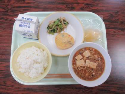 今日の献立は、ご飯 麻婆豆腐 かにたま ナムル 冷凍リンゴ 牛乳 でした。