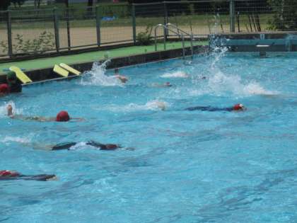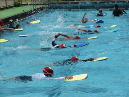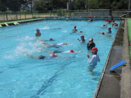 水泳教室で学んだことを生かしして、息継ぎの時の肩の回し方や足の位置など確認しながら練習をしました。