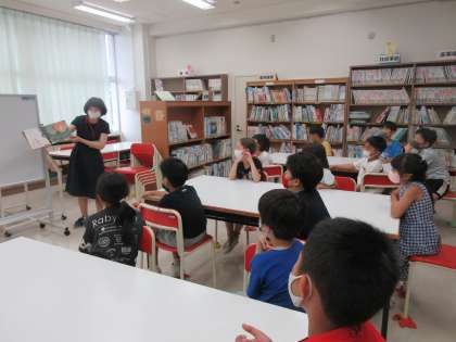 1学期最後の読み聞かせを図書室の先生にしていただきました。今回の本は「めっきらもっきら どおんどん」です。