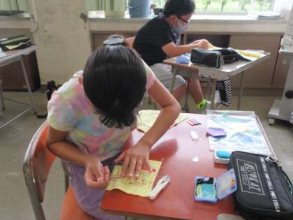 玉結びや玉留めをはじめ、手縫いも少しずつ慣れていました。自分の名前にも挑戦です。