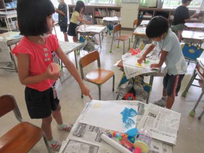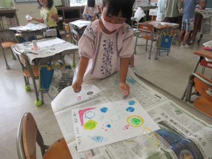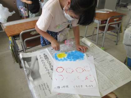 夏休み中に開かれる「WaGoだらまつり」に設置される「ミニ行燈」を作っています。思いも思いの模様の組み合わせや色使いで、素敵な行燈に仕上がっていきました。