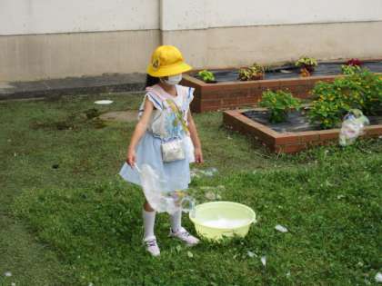 シャボン玉遊びの2回目。前回よりもいろいろな道具で、より素敵なシャボン玉を作って楽しんでいます。